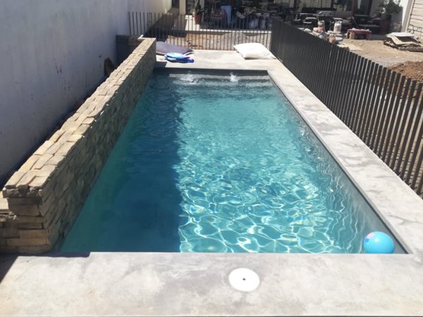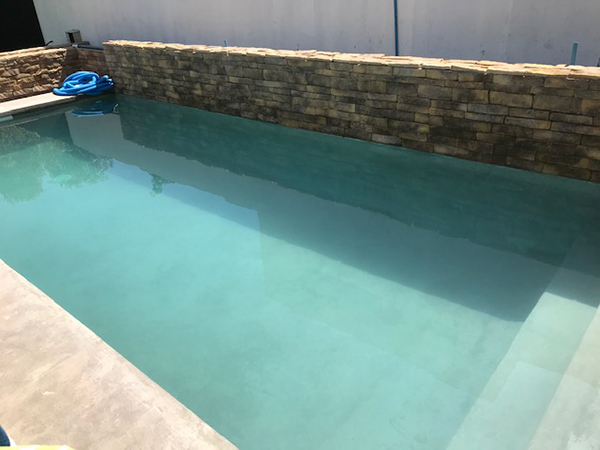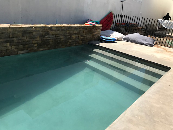 - Muros ornamentales en piscina y jardines, revestidos en piedra reconstituida color ocre.