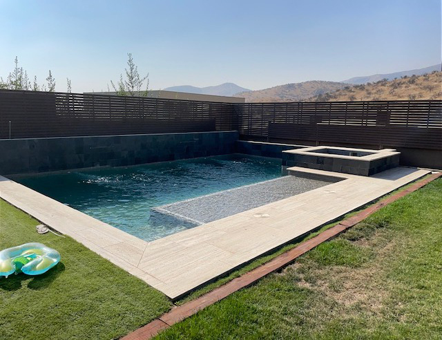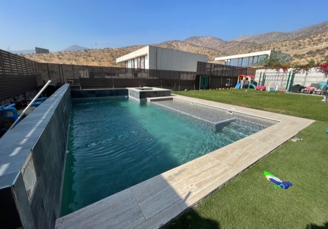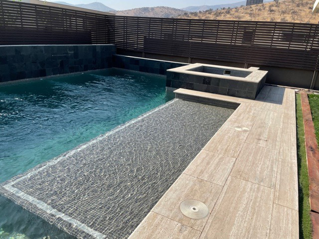 - Interiores en mosaicos vitreos, bordes y terrazas en marmol travertino.